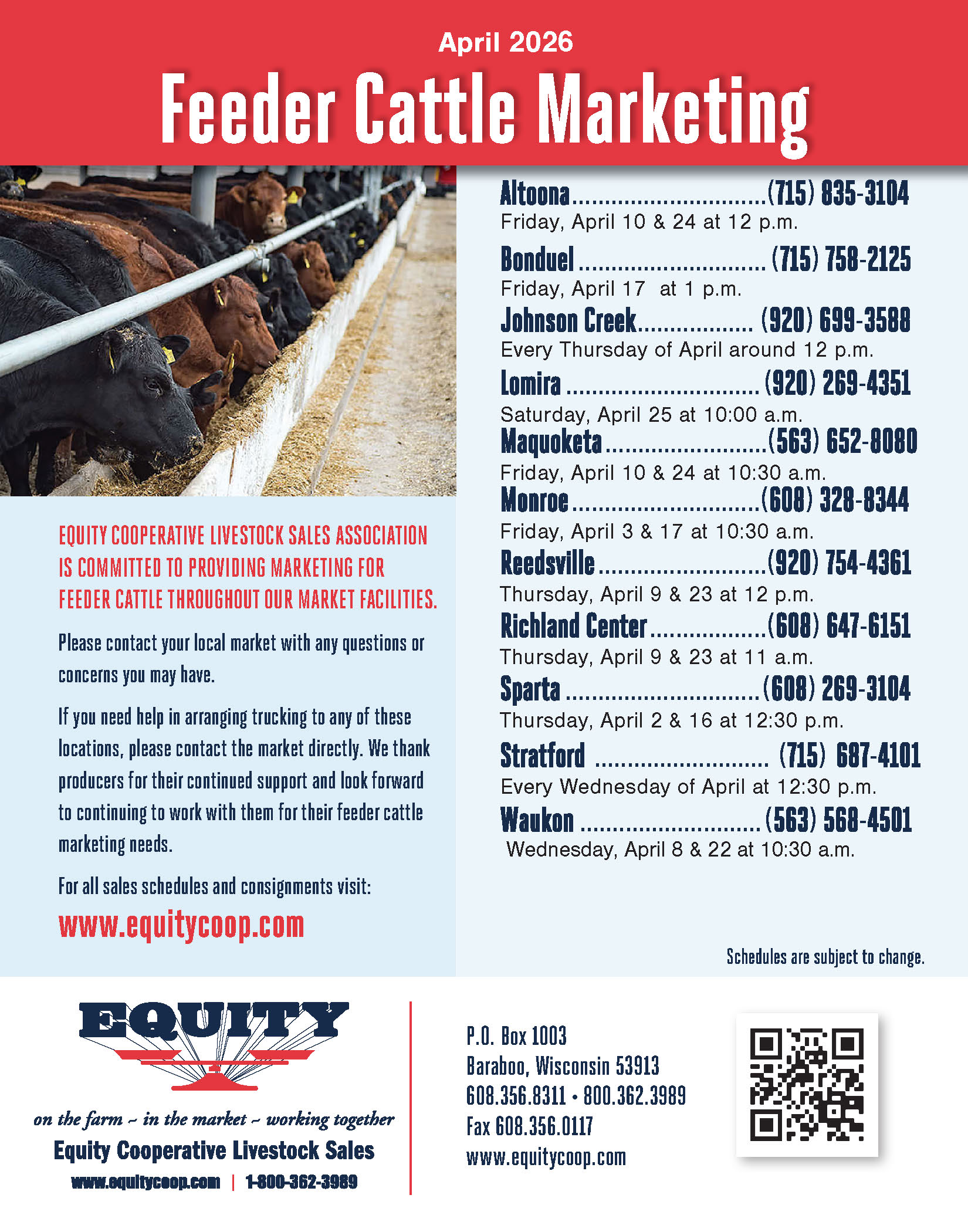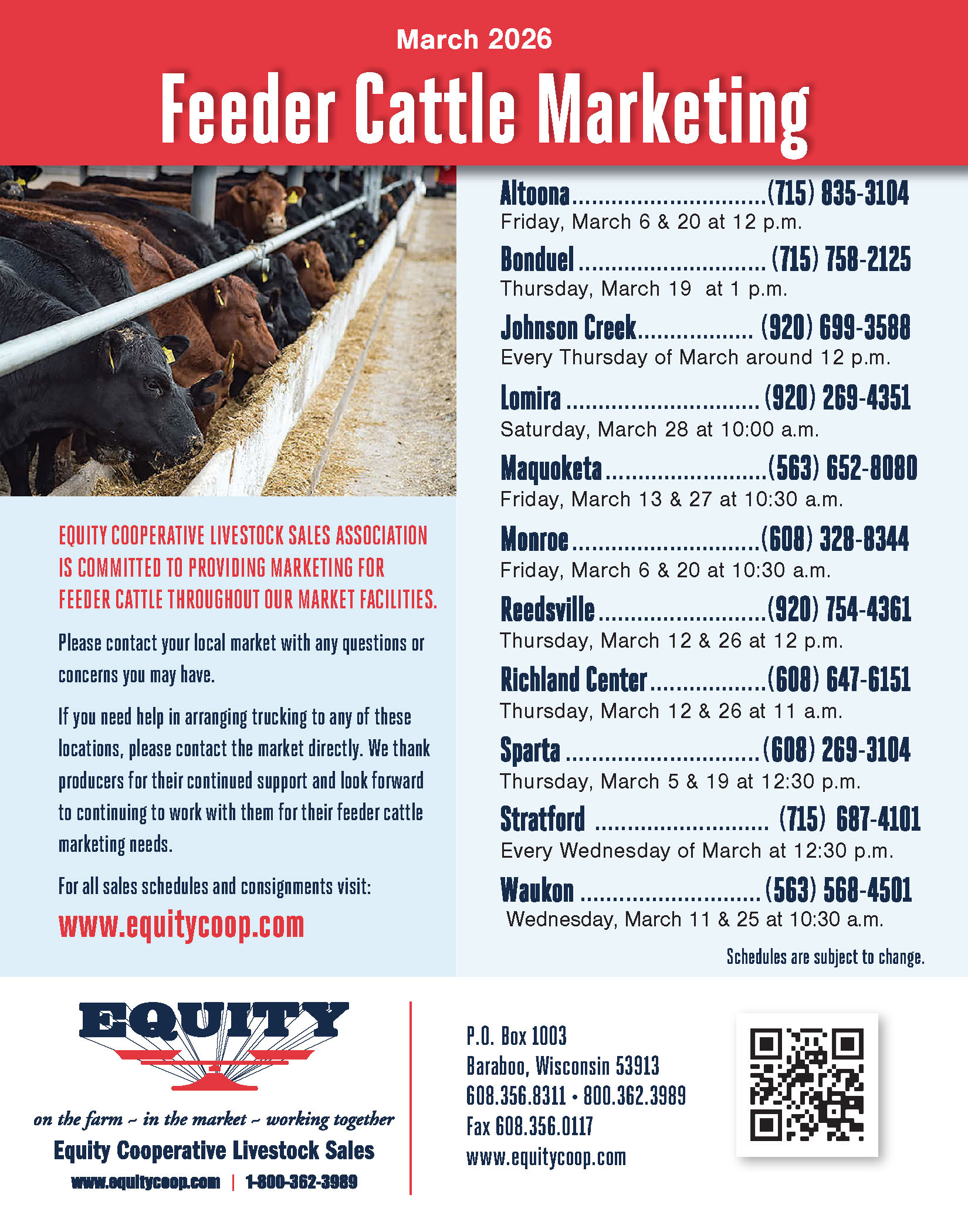 Established in 1922, Equity Cooperative Livestock Sales Association aids producers in the marketing, managing and financing of their agricultural businesses. Equity operates 12 full-service auction markets. We also have collection points in Menominee and Nisula, Michigan, as well as a livestock marketing center in Arlington, Wisconsin. Please take some time to explore the many facets of our cooperative.