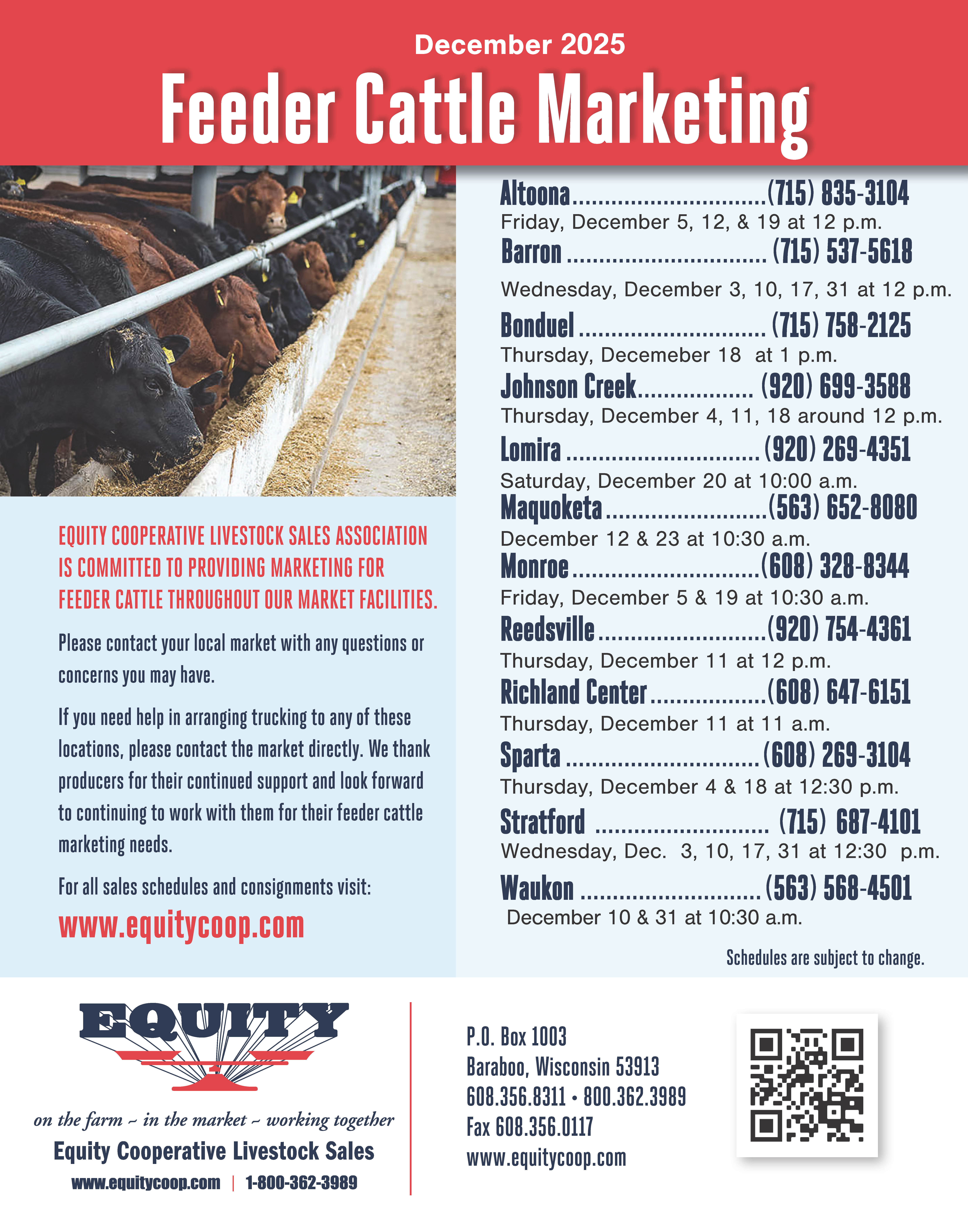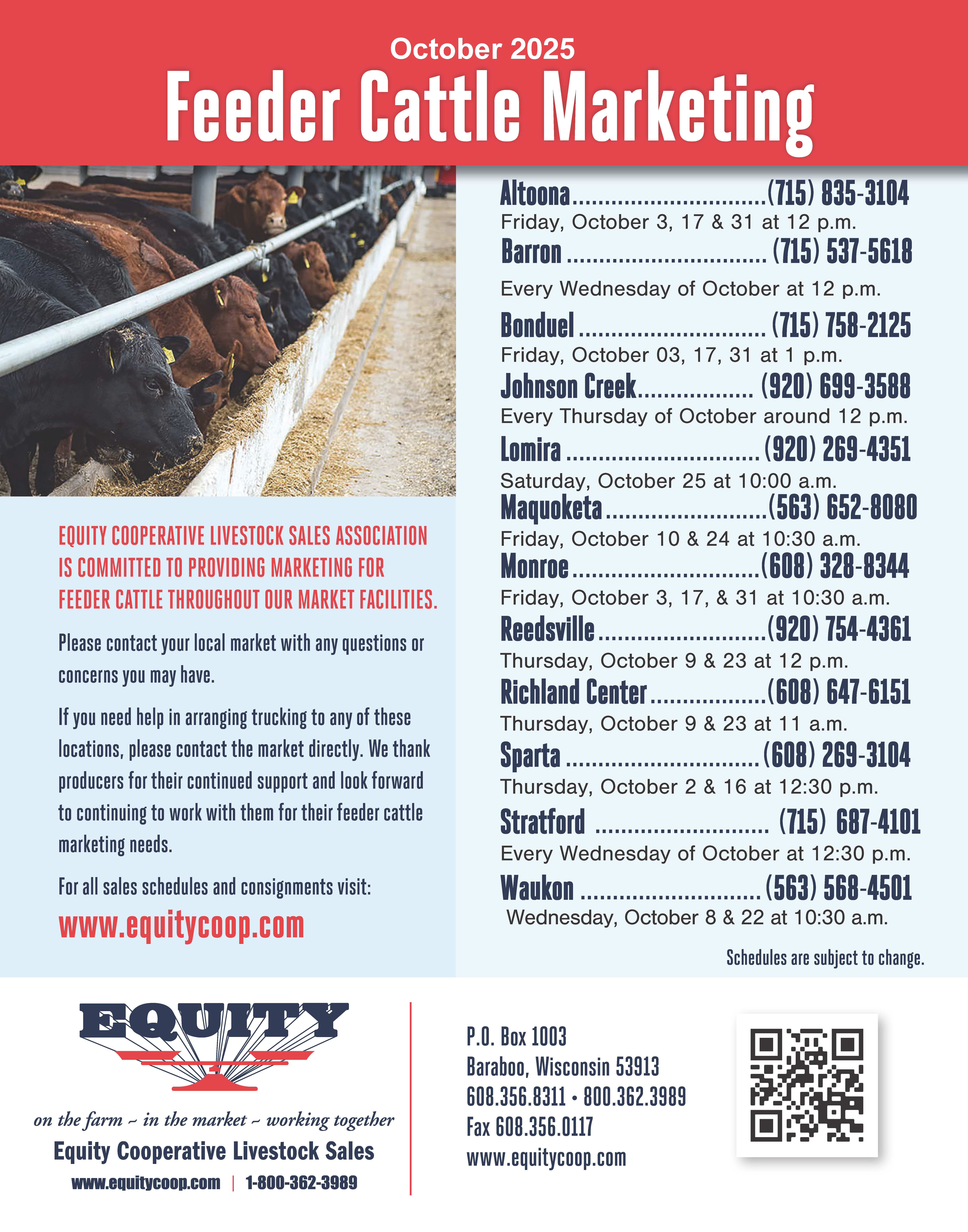 Established in 1922, Equity Cooperative Livestock Sales Association aids producers in the marketing, managing and financing of their agricultural businesses. Equity operates 12 full-service auction markets. We also have collection points in Menominee and Nisula, Michigan, as well as a livestock marketing center in Arlington, Wisconsin. Please take some time to explore the many facets of our cooperative.