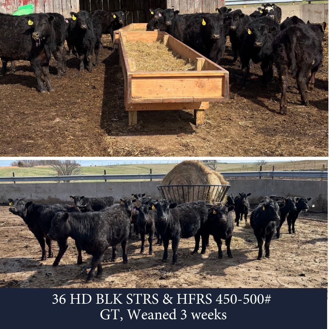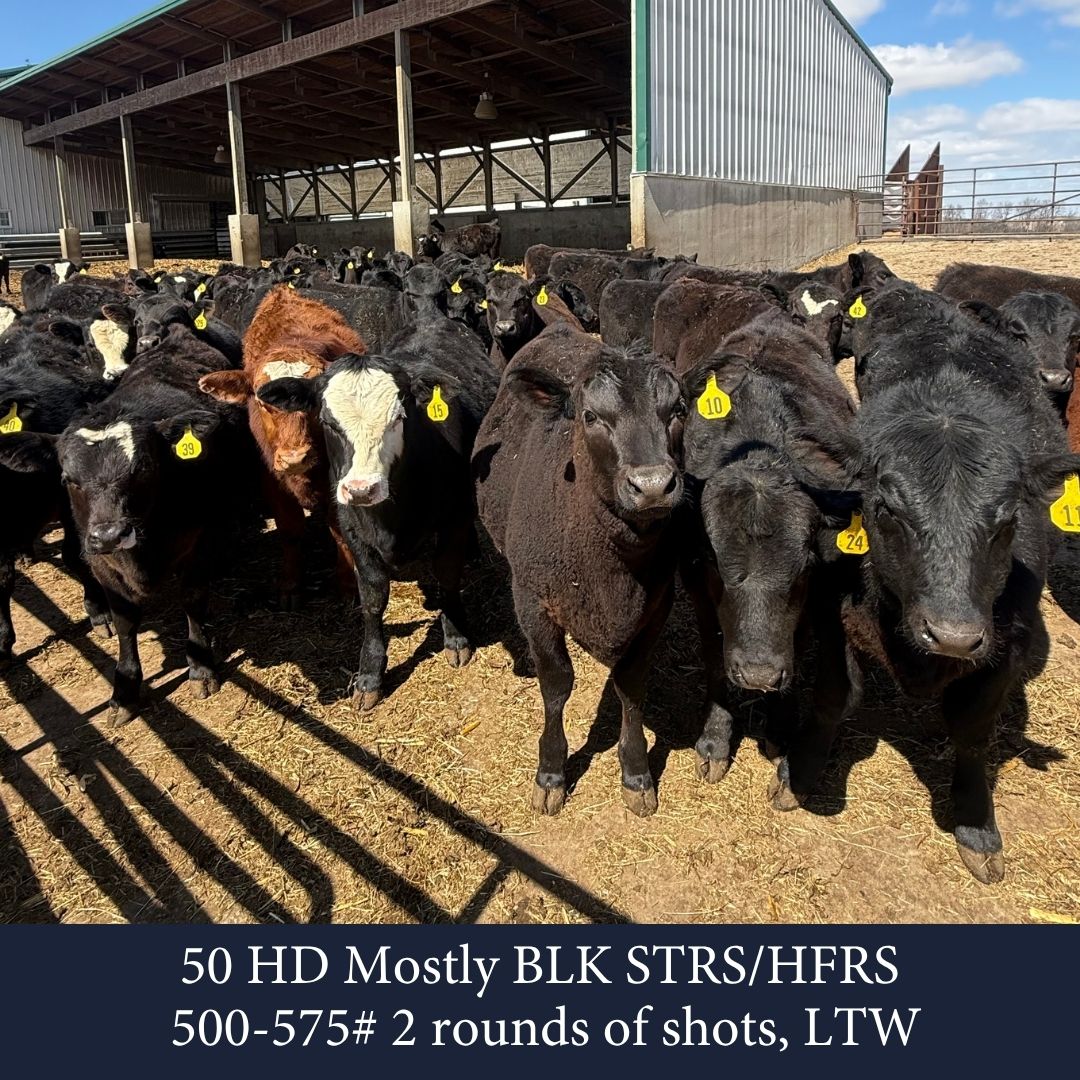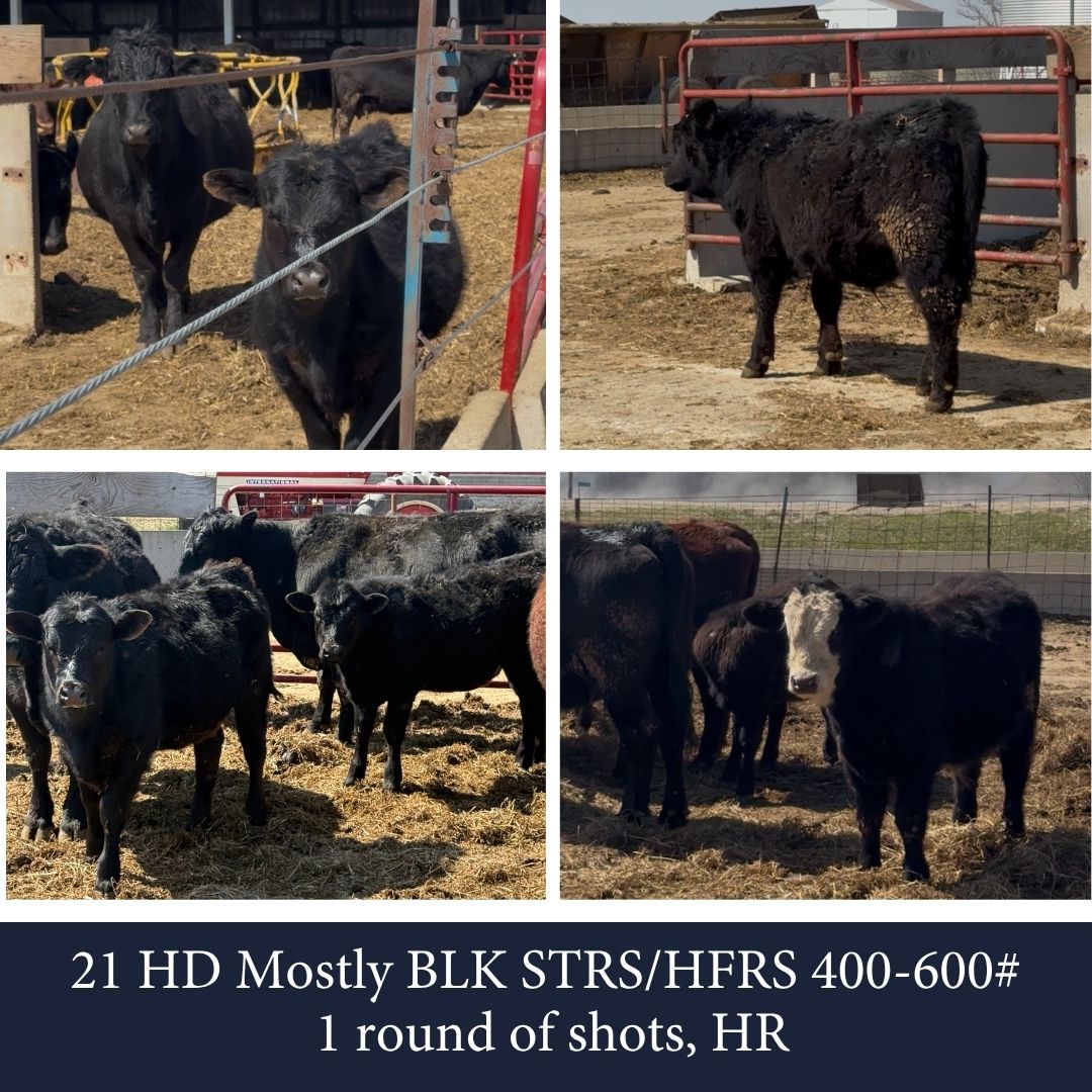 FEEDERS COMING: April 10, 2026 CONSIGNMENTS FOR THE NEXT FEEDER SALE: 50 HD Mostly BLK STRS/HFRS 500-575# 2 rounds of shots, LTW 36 HD BLK STRS/HFRS 450-500# GT, Weaned 3 Weeks 21 HD Mostly BLK STRS/HFRS 400-600# 1 round of shots, HR 35 HD Mostly BLK STRS/HFRS 500-650# GT, LTW, HR
